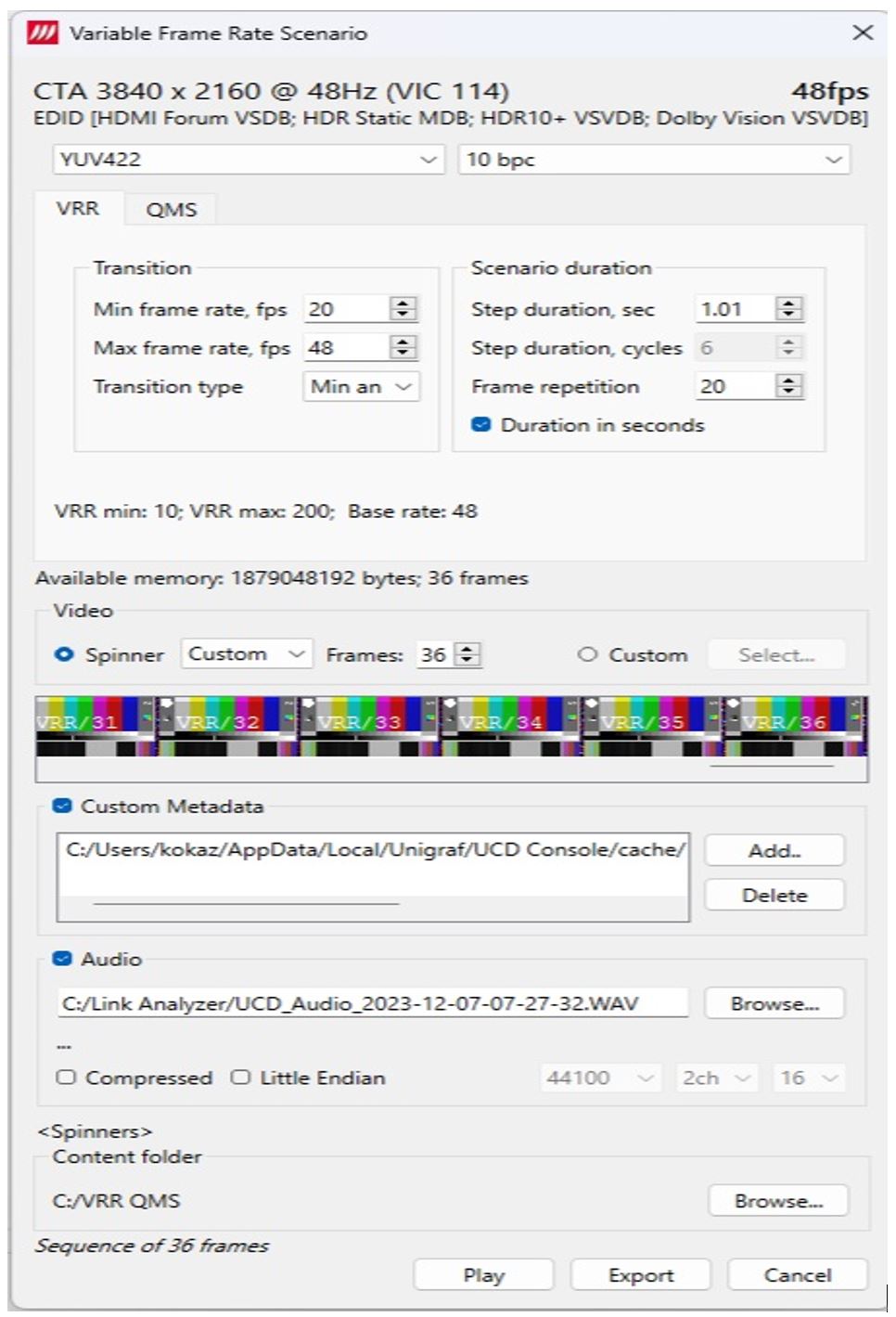 UCD-422はHDMI 2.1(非圧縮10K@30Hz)の入出力インターフェースを持つシンク、ソース及びリピーター機器の試験が可能なテストデバイスです。FRL(Fixed Rate Link)、VRR(Variable Refresh Rate)、DSC(Display Stream Compression)、ALLM(Auto Low Latency Mode)、QMS(Quick Media Switching)、eARC、HDCP(1.4/2.3)等の各種機能に対応。信号出力タイミングやパケットデータを任意にカスタマイズ可能。映像、音声、パケットデータをフレーム単位で登録、再生を可能にするシナリオ再生モードにも対応しています。