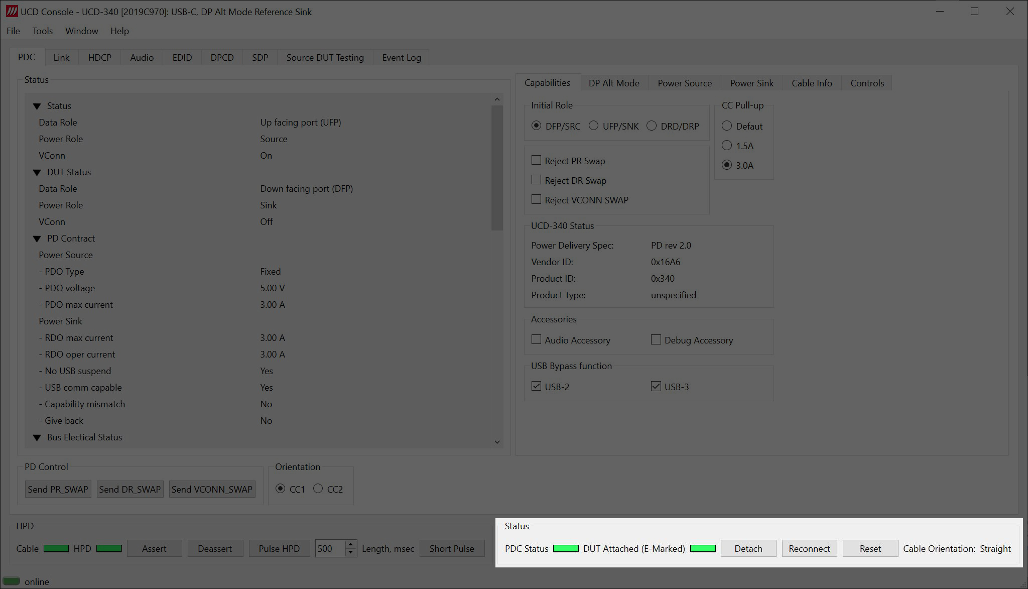 Green light for the DUT attached indicates that the DUT is plugged in. E-marked shows that the cable used is a E-marked cable. For more information on E-Marked click here.